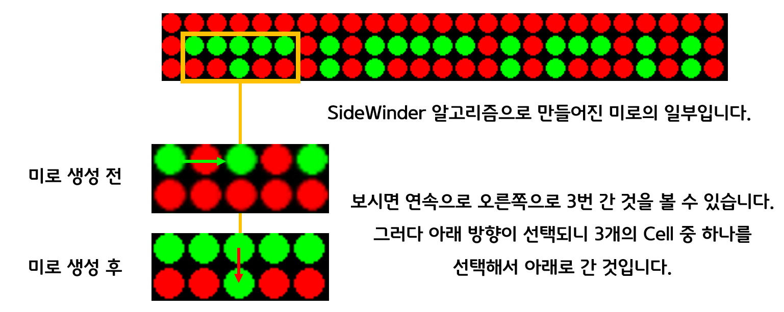 오른쪽으로 연속 이동한 횟수를 Count하여 오른쪽 이동 중 아래로 이동하는 옵션이 선택되면 오른쪽 연속으로 이동한 Cell 중 랜덤으로 선택하여 그 Cell에서 아래로 길을 틉니다.