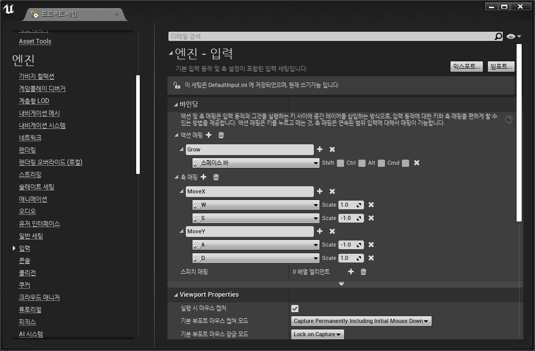 바인딩이라는 항목에서 액션 매핑, 축 매핑 중 적절한 것에 키를 할당해주면 된다.